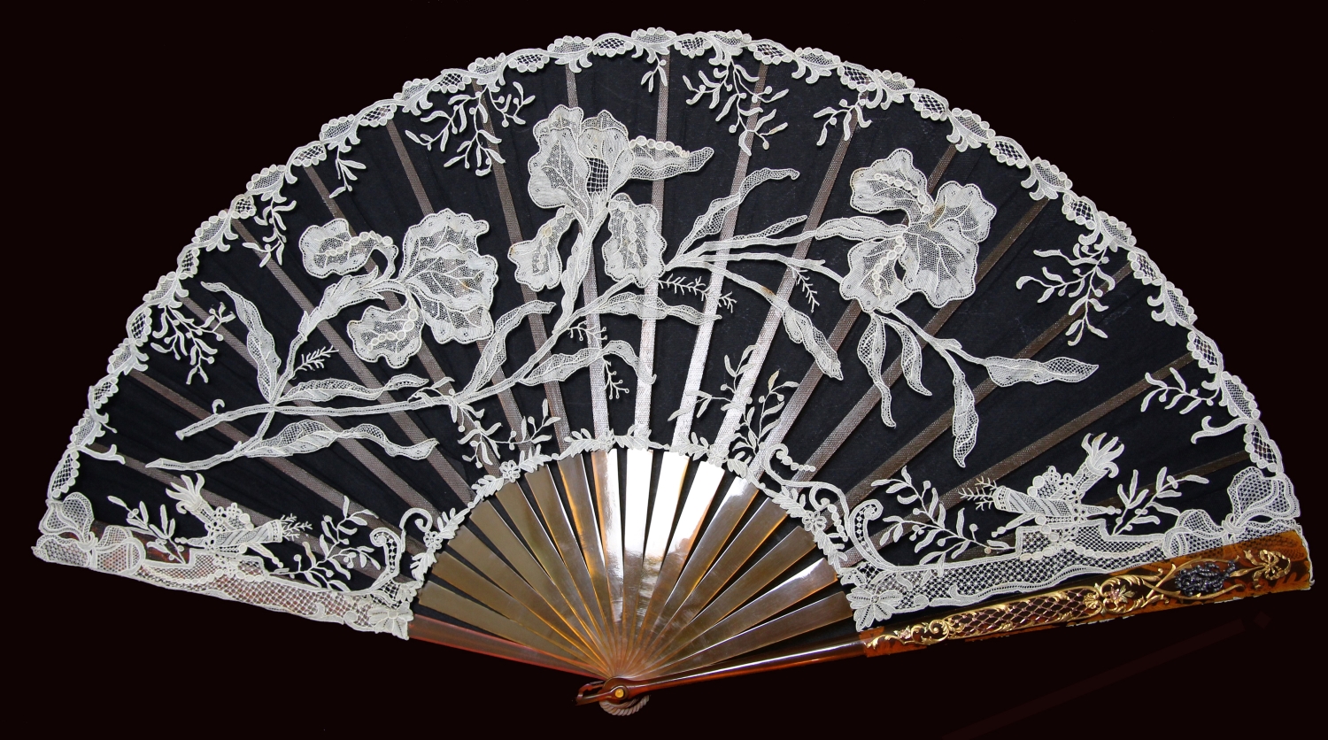 c 1895   Application de dentelle de point de Bruxelles ou nord de la France Monture écaille blonde, panaches avec application de treillage et rubans d'or de 3 couleurs, chiffre en diamants